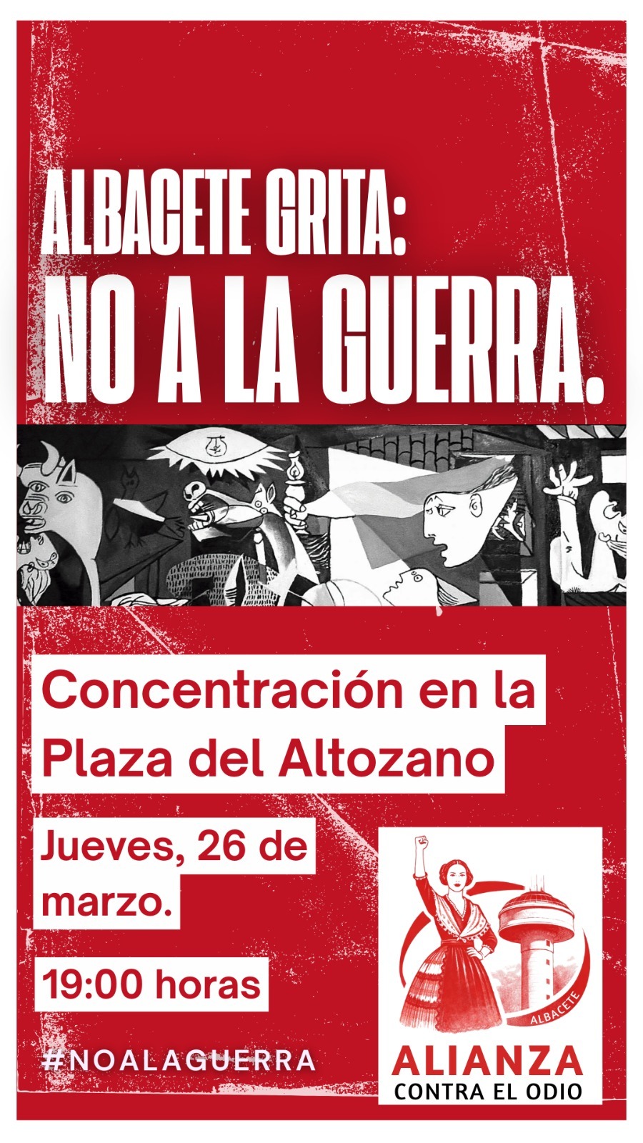 La ciudad de Albacete será escenario este jueves 26 de marzo de una concentración en la Plaza del Altozano a las 19:00 horas para manifestar un rechazo frontal a los conflictos bélicos actuales, No a la guerra. La convocatoria, impulsada por la plataforma Alianza contra el Odio, tiene como objetivo defender la paz, la diplomacia y el respeto entre los pueblos como alternativas a la violencia armada. En el encuentro se destacará la necesidad de proteger valores como la igualdad, el feminismo y el ecologismo para fortalecer una convivencia democrática frente a la barbarie de la guerra.