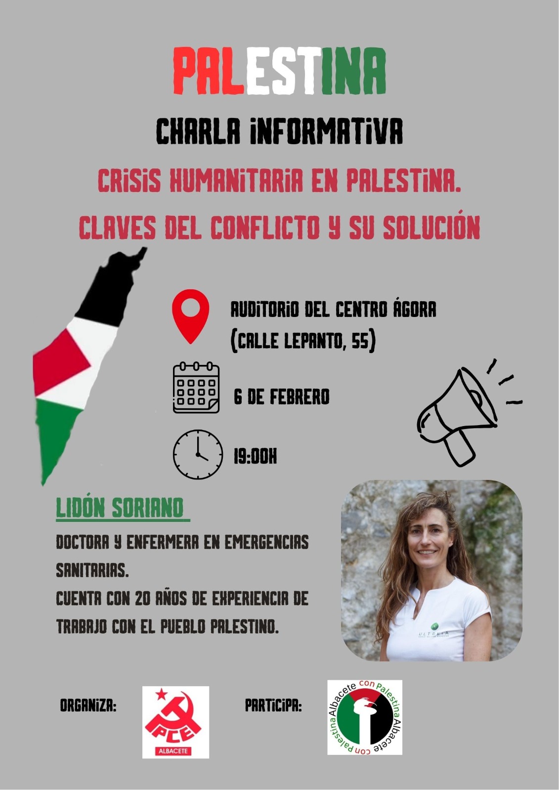 El próximo viernes 6 de febrero, el Auditorio del Centro Ágora de Albacete acogerá una charla informativa sobre la crisis humanitaria en Palestina, centrada en las claves del conflicto y las posibles vías para su resolución, organizado por el PCE en Albacete. El acto comenzará a las 19:00 horas y está abierto al público.