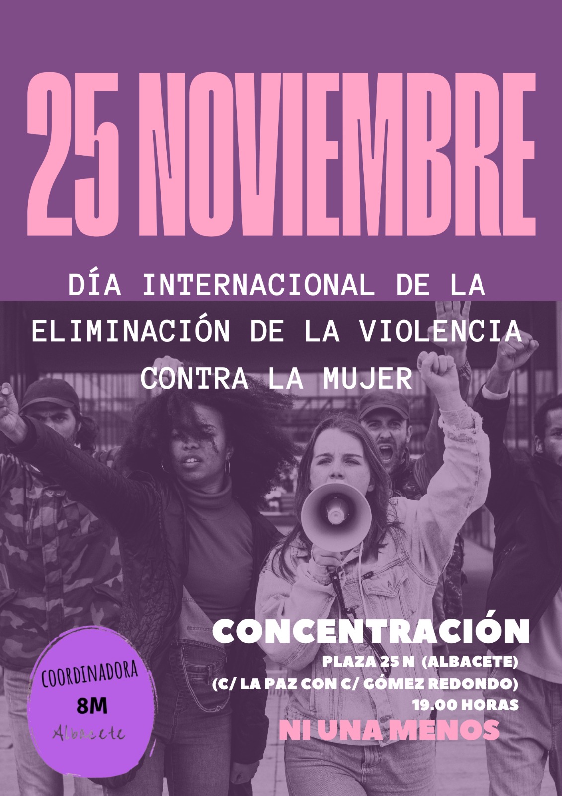 Albacete volverá a concentrarse el próximo martes, 25 de noviembre, Día Internacional de la Eliminación de la Violencia contra la Mujer, en un acto convocado por la Coordinadora 8M Albacete. La cita será a las 19:00 horas en la Plaza 25N, ubicada en la confluencia de las calles La Paz y Gómez Redondo. La Coordinadora 8M Albacete está compuesta por distintos movimientos sociales, asociaciones, sindicatos y partidos políticos de la ciudad.