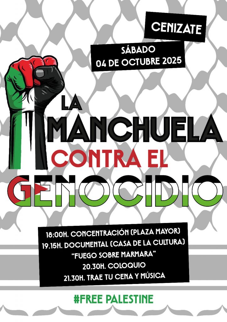 Dos días después, el sábado 4 de octubre, la localidad de Cenizate acogerá una jornada bajo el título “La Manchuela contra el genocidio”. La cita comenzará a las 18:00 horas en la Plaza Mayor, seguida de la proyección del documental “Fuego sobre Mármara” en la Casa de la Cultura, un coloquio y una cena popular con música.