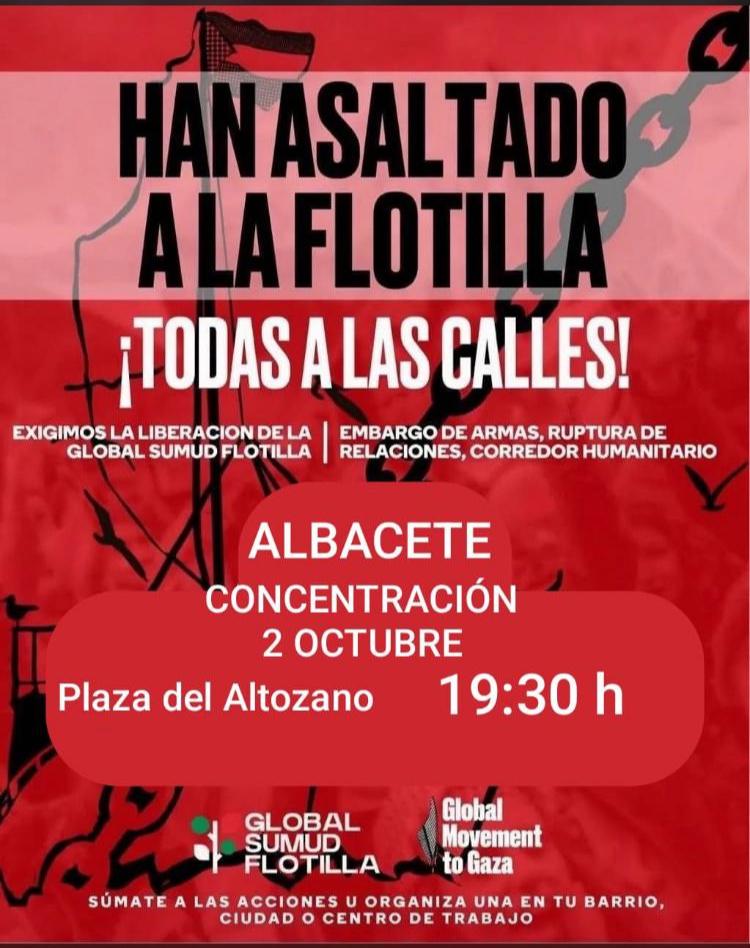 En la provincia de Albacete, se han convocado distintas movilizaciones en solidaridad con el pueblo palestino y para exigir el fin del bloqueo y la liberación de la Flotilla Global Sumud.