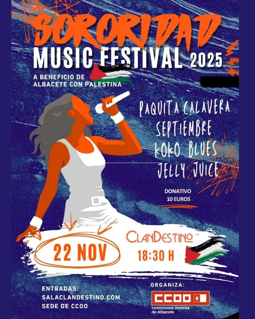 El Sororidad Music Festival 2025 de CCOO recaudará fondos para Albacete con Palestina