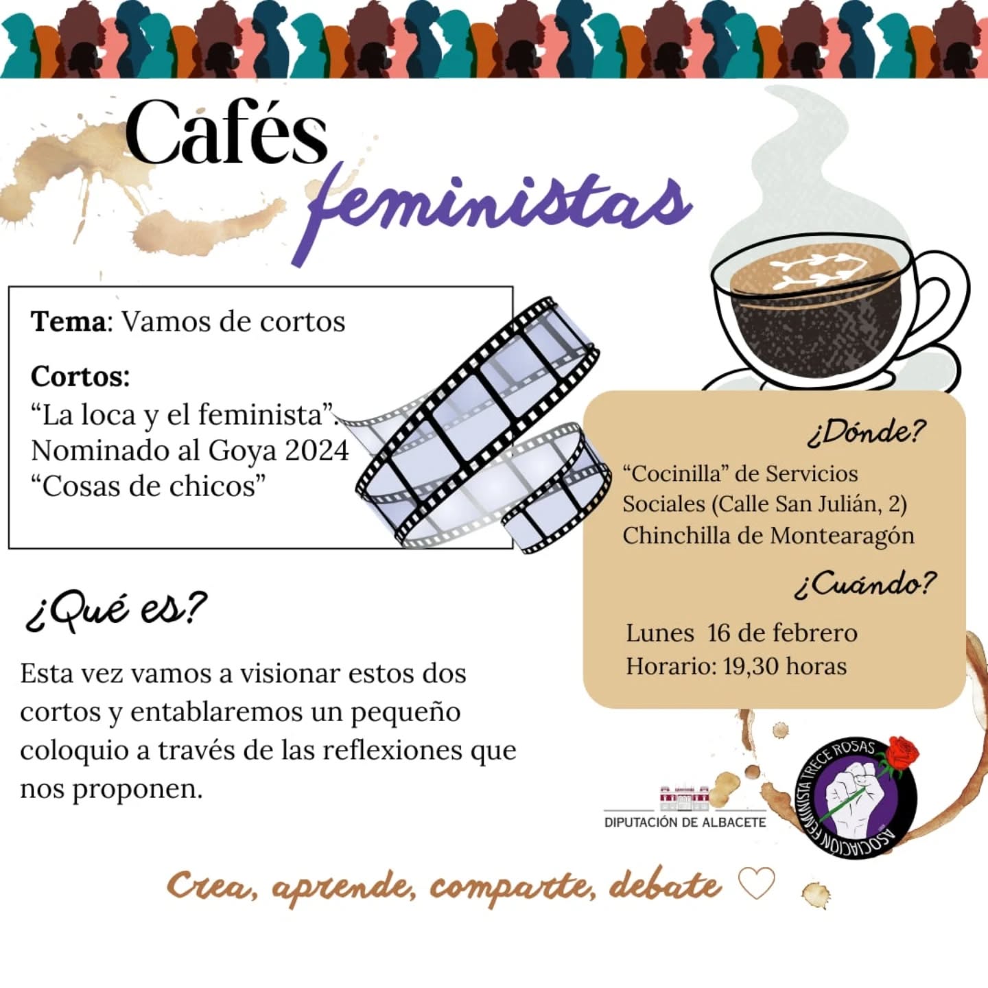 La Asociación Feminista Trece Rosas de Chinchilla de Montearagón continúa organizando sus encuentros “Cafés feministas”, una iniciativa cultural pensada para fomentar el diálogo, el aprendizaje colectivo y el debate social en torno a la igualdad. El último café tuvo lugar en diciembre y trató sobre gordofobia y cuerpos disidentes.