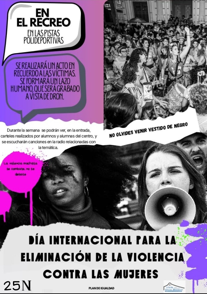 Durante el recreo, en las pistas polideportivas, se llevará a cabo un acto que incluirá la formación de un gran lazo humano, símbolo de apoyo y recuerdo hacia las mujeres víctimas de violencia de género. Esta acción será grabada desde el aire mediante un dron. La organización ha pedido a todo el alumnado y personal asistir vestidos de negro como gesto de duelo y solidaridad.