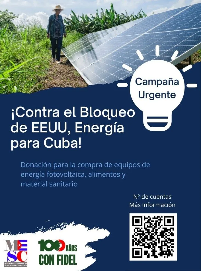 El Movimiento Estatal de Solidaridad con Cuba (MESC), que agrupa a 65 asociaciones y colectivos del Estado español, ha activado una campaña de urgencia bajo el lema “Contra el Bloqueo de EE.UU., Energía para Cuba” tras la nueva Orden Ejecutiva aprobada el pasado 29 de enero por el presidente estadounidense Donald Trump.