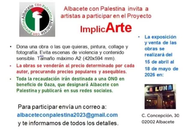 Albacete con Palestina ha lanzado una convocatoria artística para participar en el proyecto “ImplicArte”, una exposición solidaria que se celebrará del 15 de abril al 18 de mayo de 2026 en el pub La Luna, situado en la calle Concepción nº 30 de Albacete.