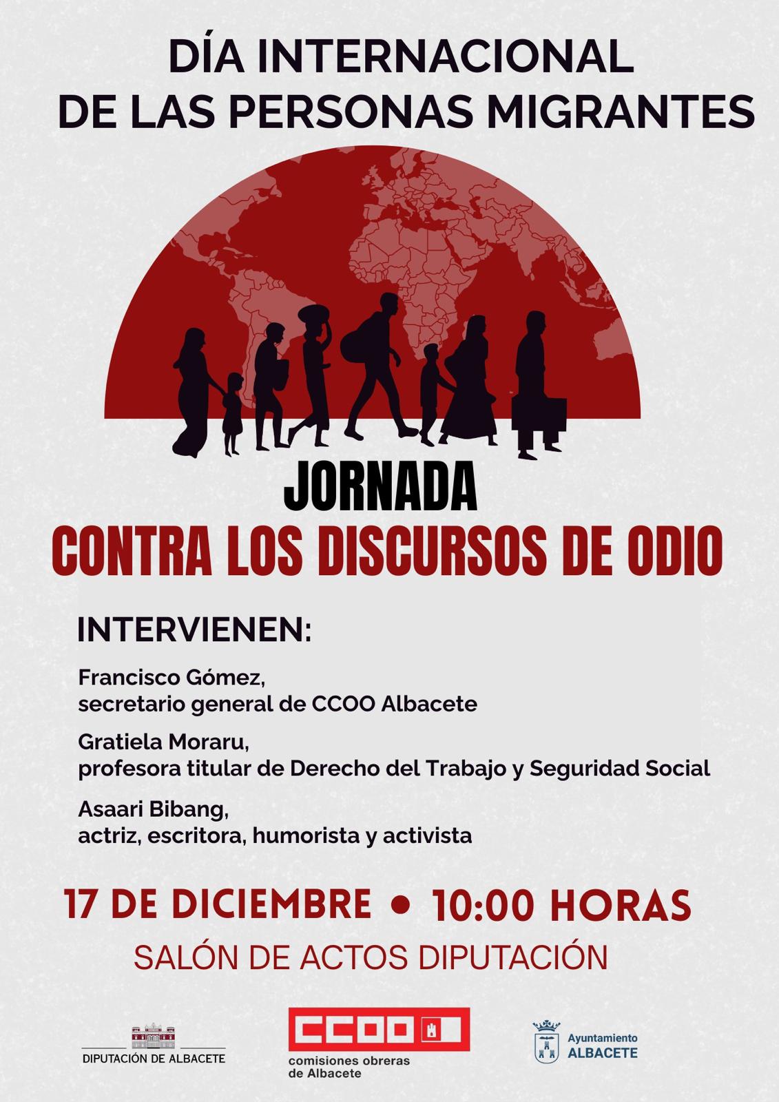 Albacete celebrará el próximo miércoles 17 de diciembre, a las 10:00 horas, una jornada contra los discursos de odio en el marco del Día Internacional de las Personas Migrantes. El acto tendrá lugar en el Salón de Actos de la Diputación de Albacete y reunirá a representantes sindicales, académicos y del ámbito cultural y social.