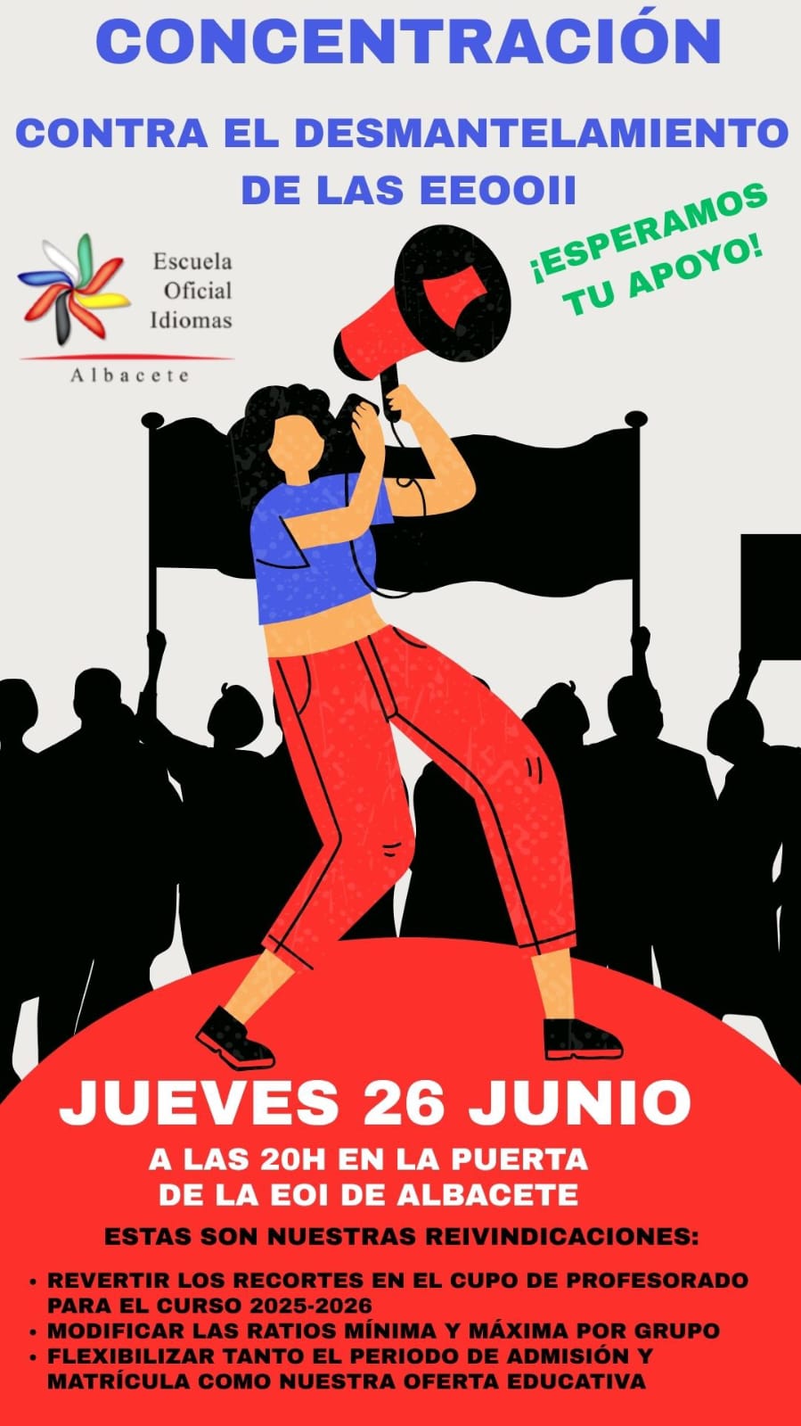 El próximo jueves 26 de junio a las 20:00 en la puerta de la Escuela Oficial de Idiomas de Albacete se concentraran contra el desmatelamiento de las EEOOII.